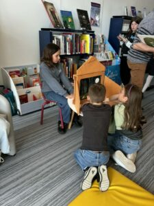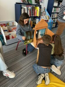 Ils ont commencé par un Kamishibai sur l’album « Il Faudra ». Le principe est de faire défiler des illustrations, en tant que spectateurs on ne voit pas les textes.